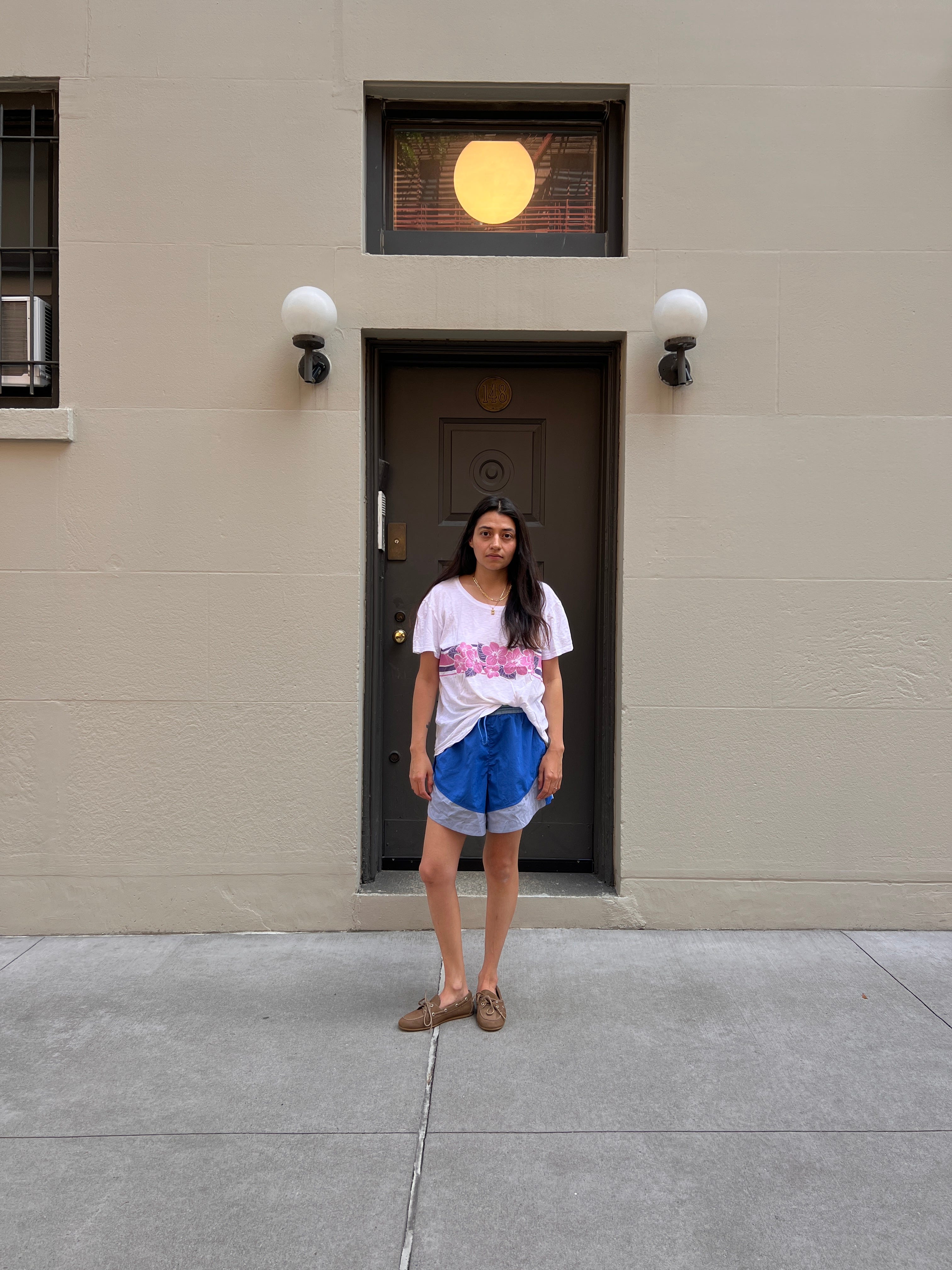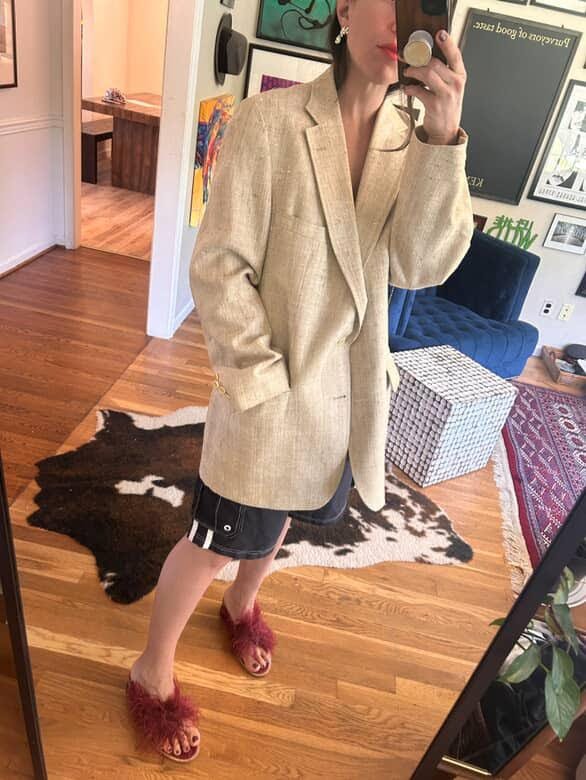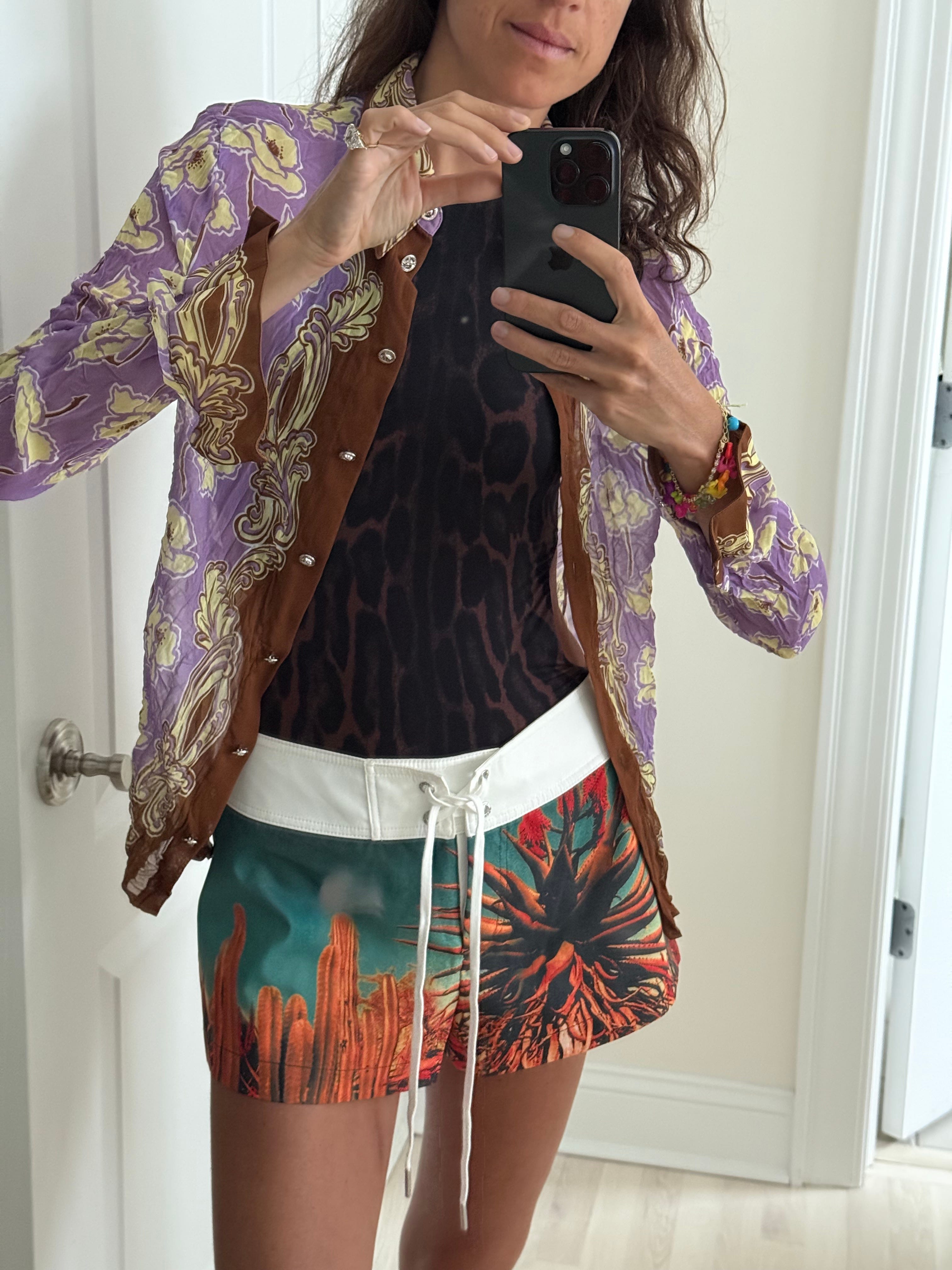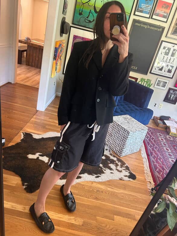 “Board shorts to me are the epitome of cool and I love the way I feel in them- at ease, chill, like myself (I have forever been a tomboy). They remind me of my youth in the very best way having grown up in the 90s. These are 90s Ocean Pacific board shorts I recently found thrifting and slid them on and couldn’t believe it. I’ve been searching for a good vintage pair thrifting for years. They just make me so happy when I’m wearing them. They go with everything! I can wear them to work (I’m in a creative position), out for the night, and of course to the beach. You can style them hundreds of ways, and they knock more fancy pieces all the way down to low key— which is my favorite thing about them.”