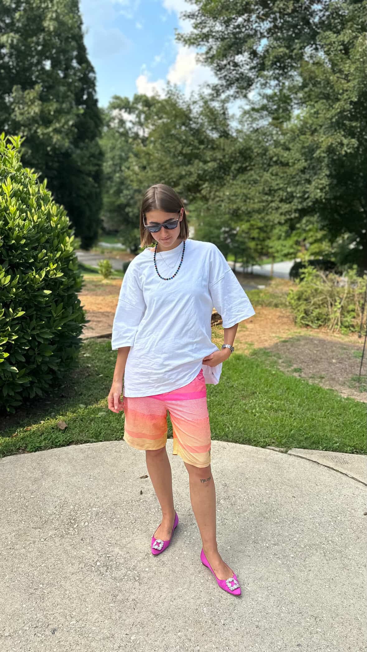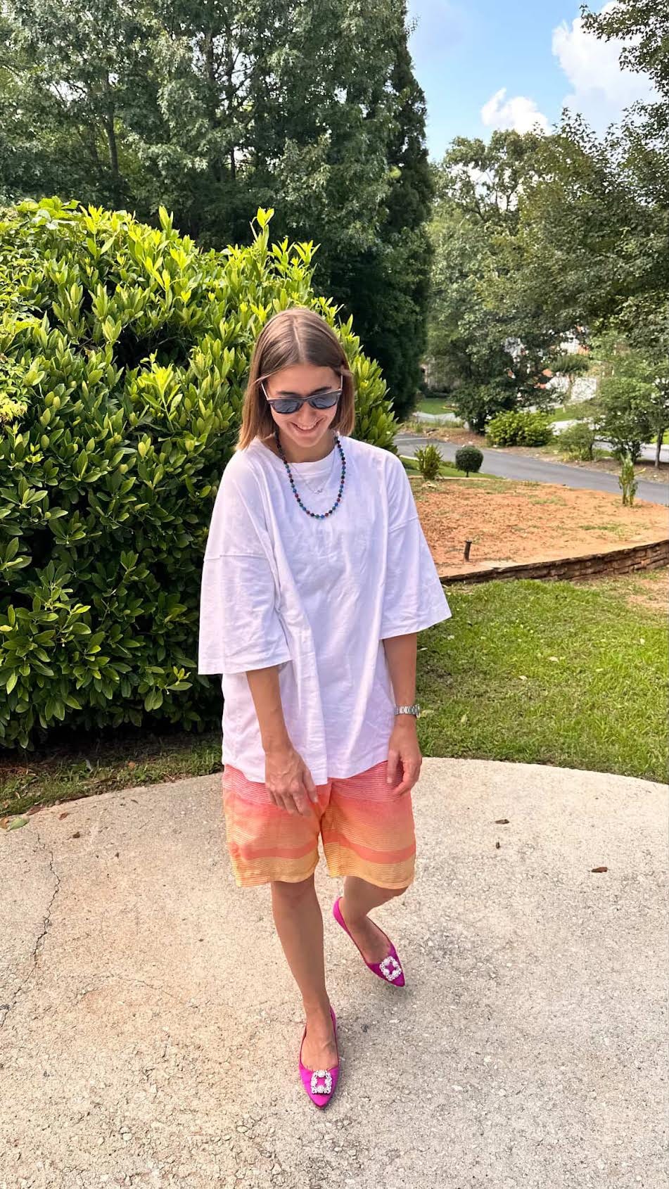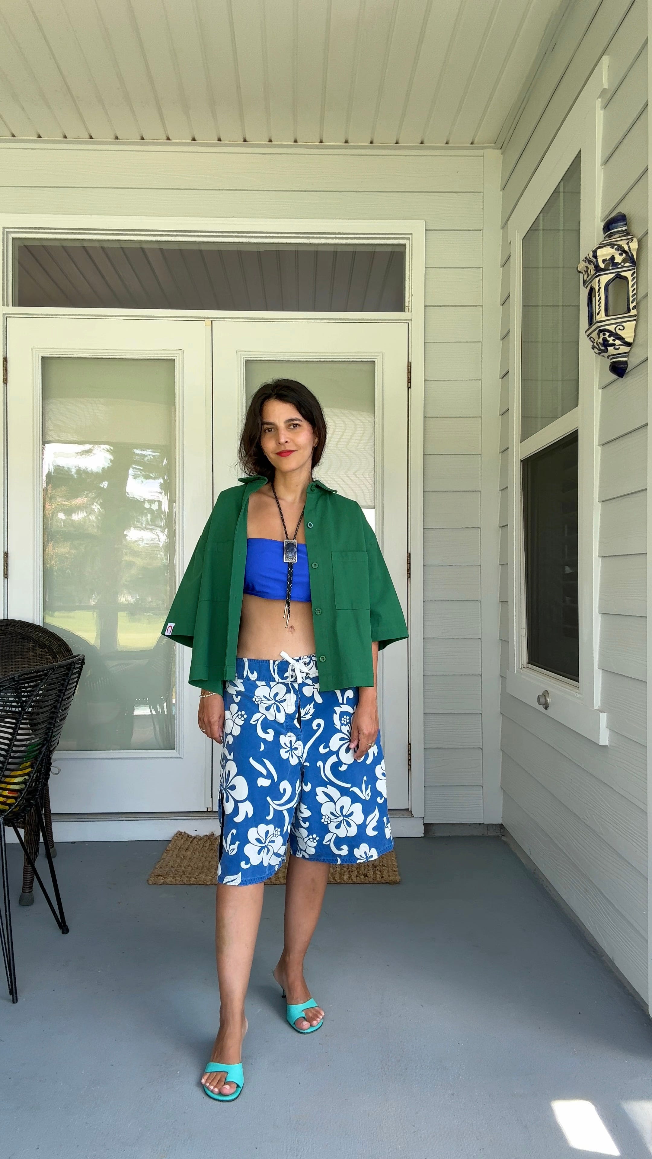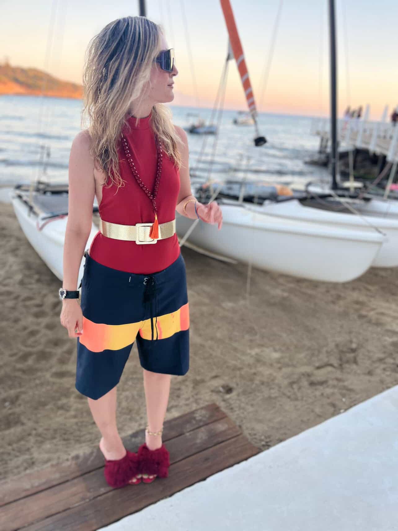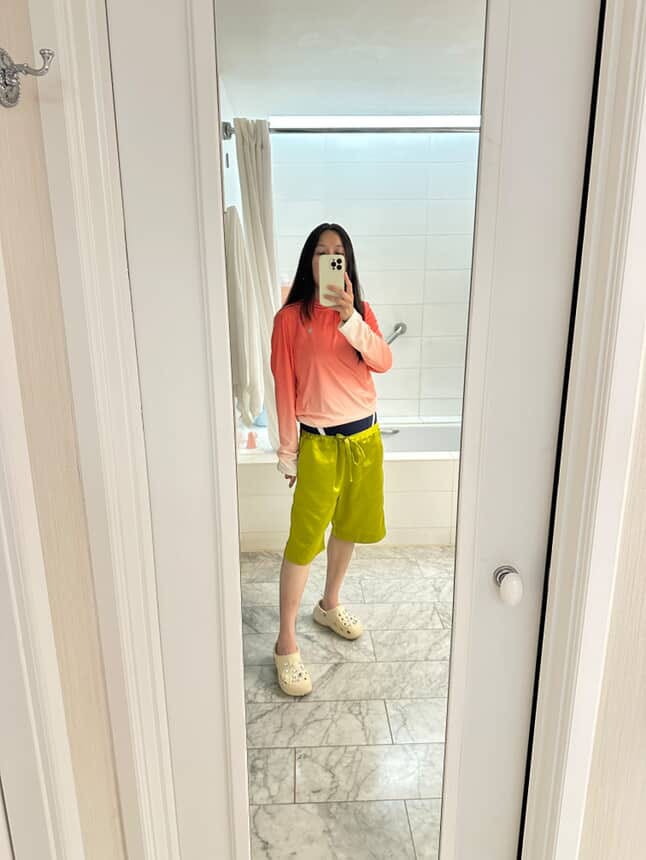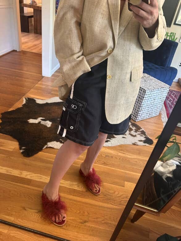 They’ve become my go-to for experimenting with color in a way that still feels grounded. The board short silhouette provides ease and comfort without leaning too athletic. I pair them with everything from button-downs and T-shirts to, this year, a UV-protectant sports top (inspired by Laura). Worn over a swimsuit, the outfit gained another interesting layer. It became my effortless poolside look during a recent family vacation.