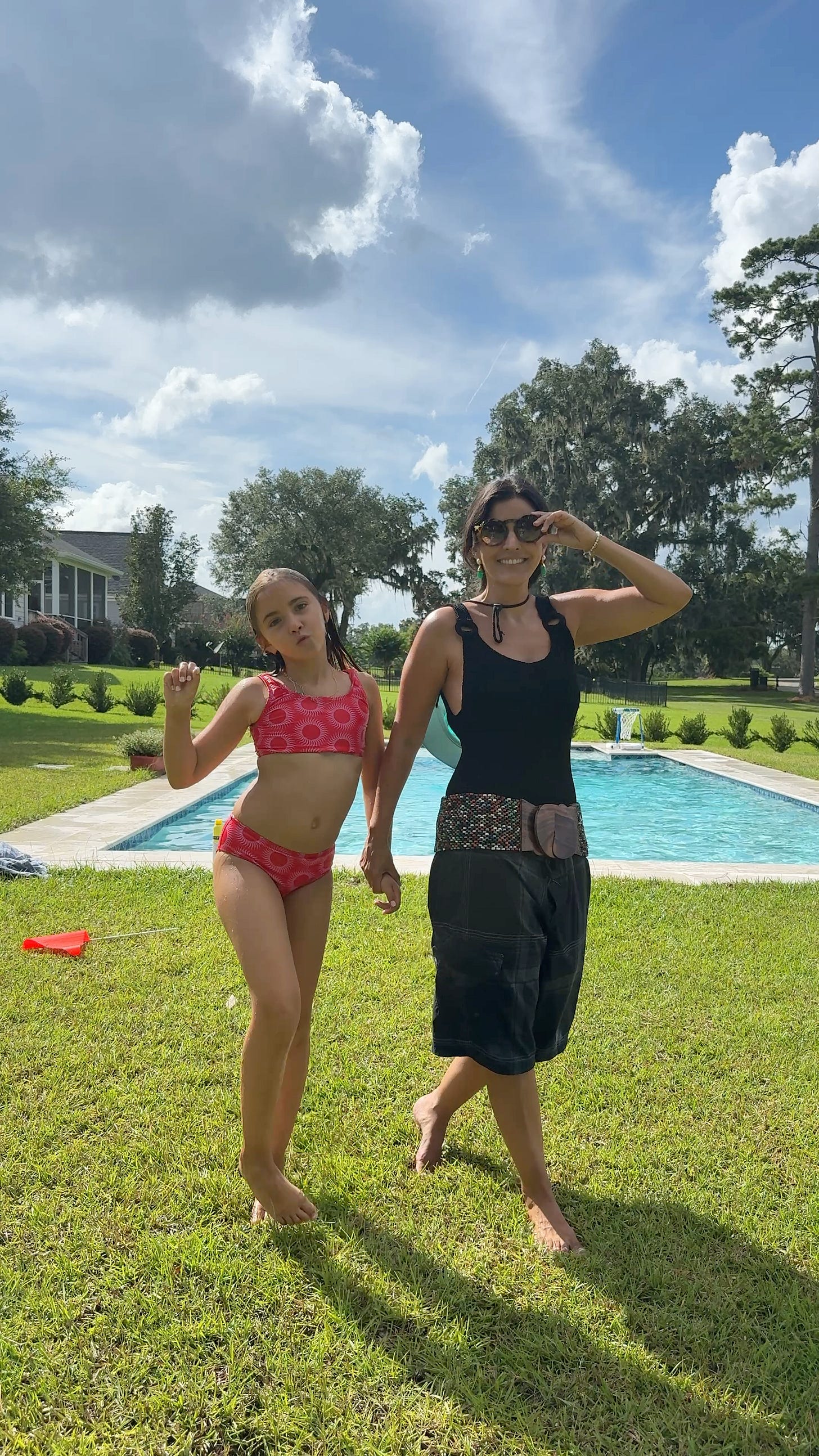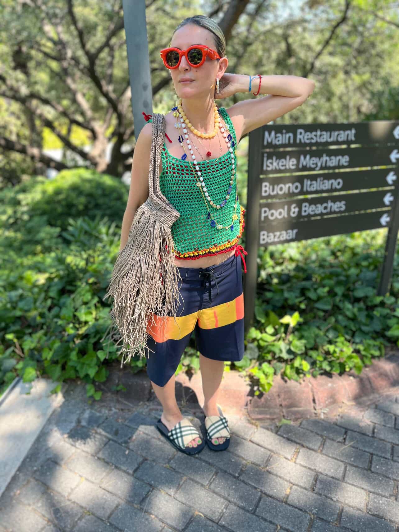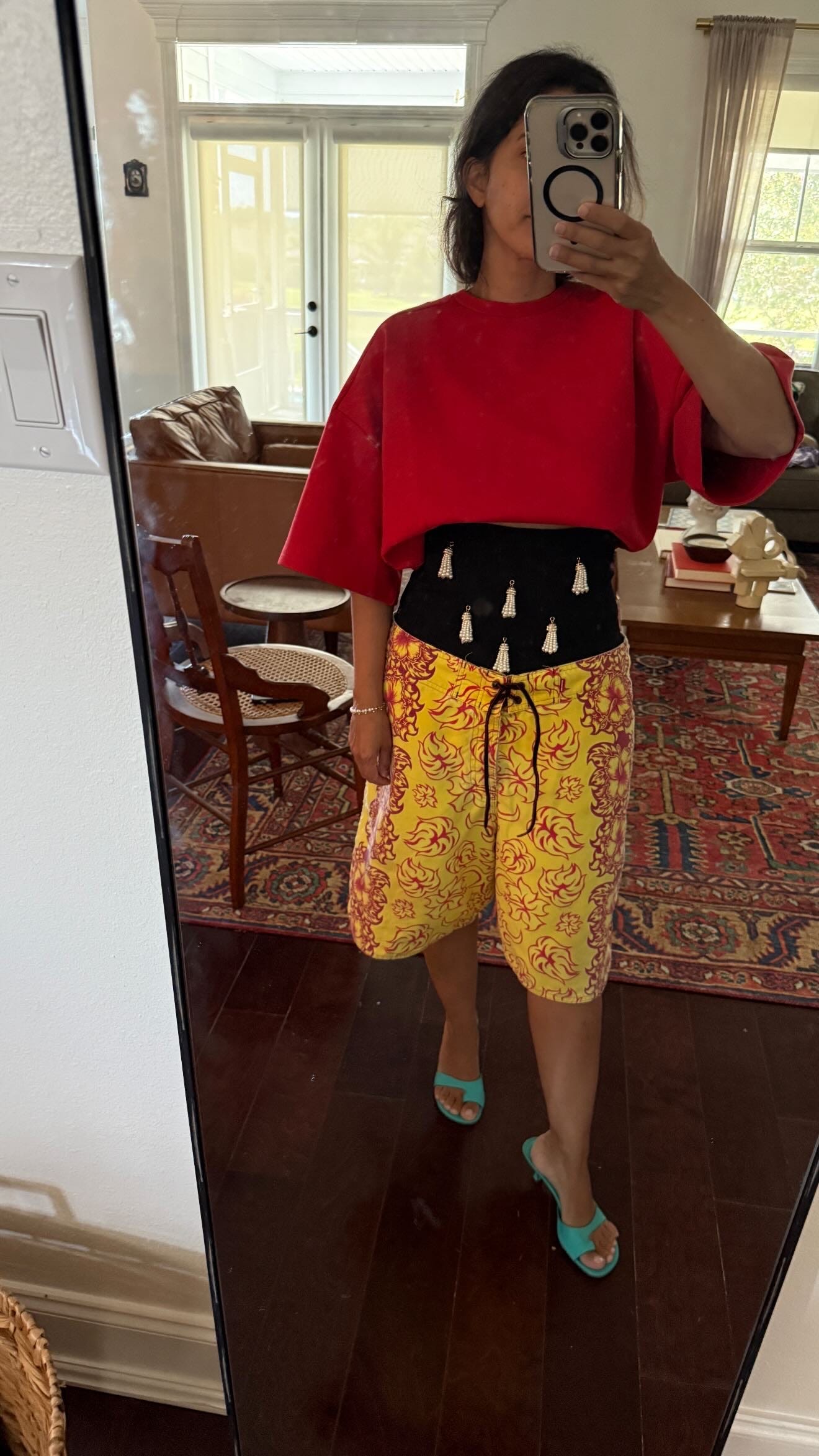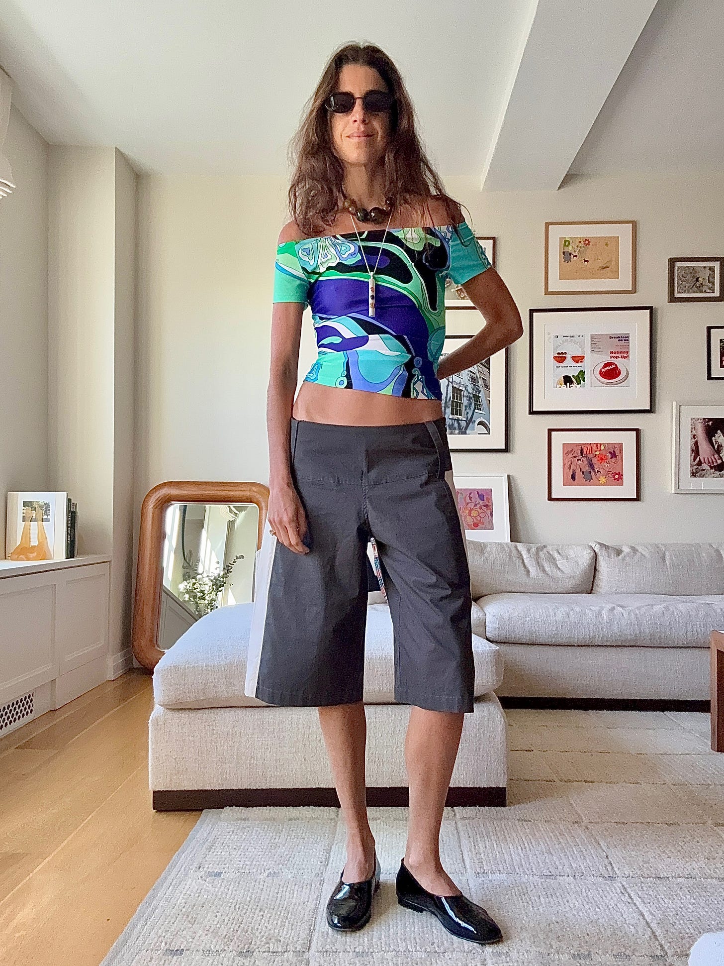 They’ve become my go-to for experimenting with color in a way that still feels grounded. The board short silhouette provides ease and comfort without leaning too athletic. I pair them with everything from button-downs and T-shirts to, this year, a UV-protectant sports top (inspired by Laura). Worn over a swimsuit, the outfit gained another interesting layer. It became my effortless poolside look during a recent family vacation.