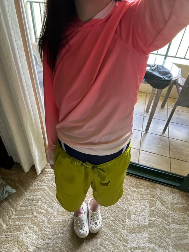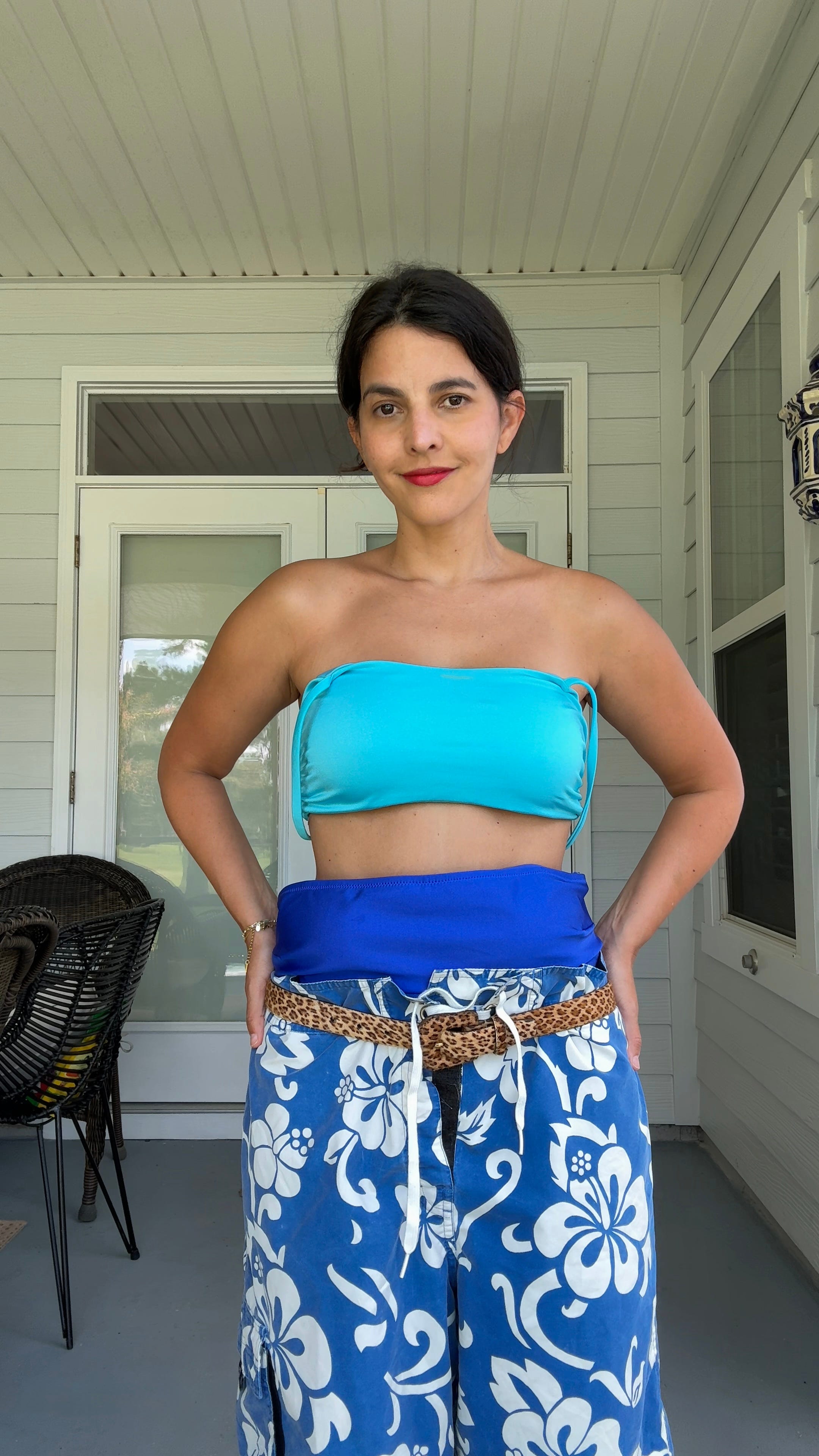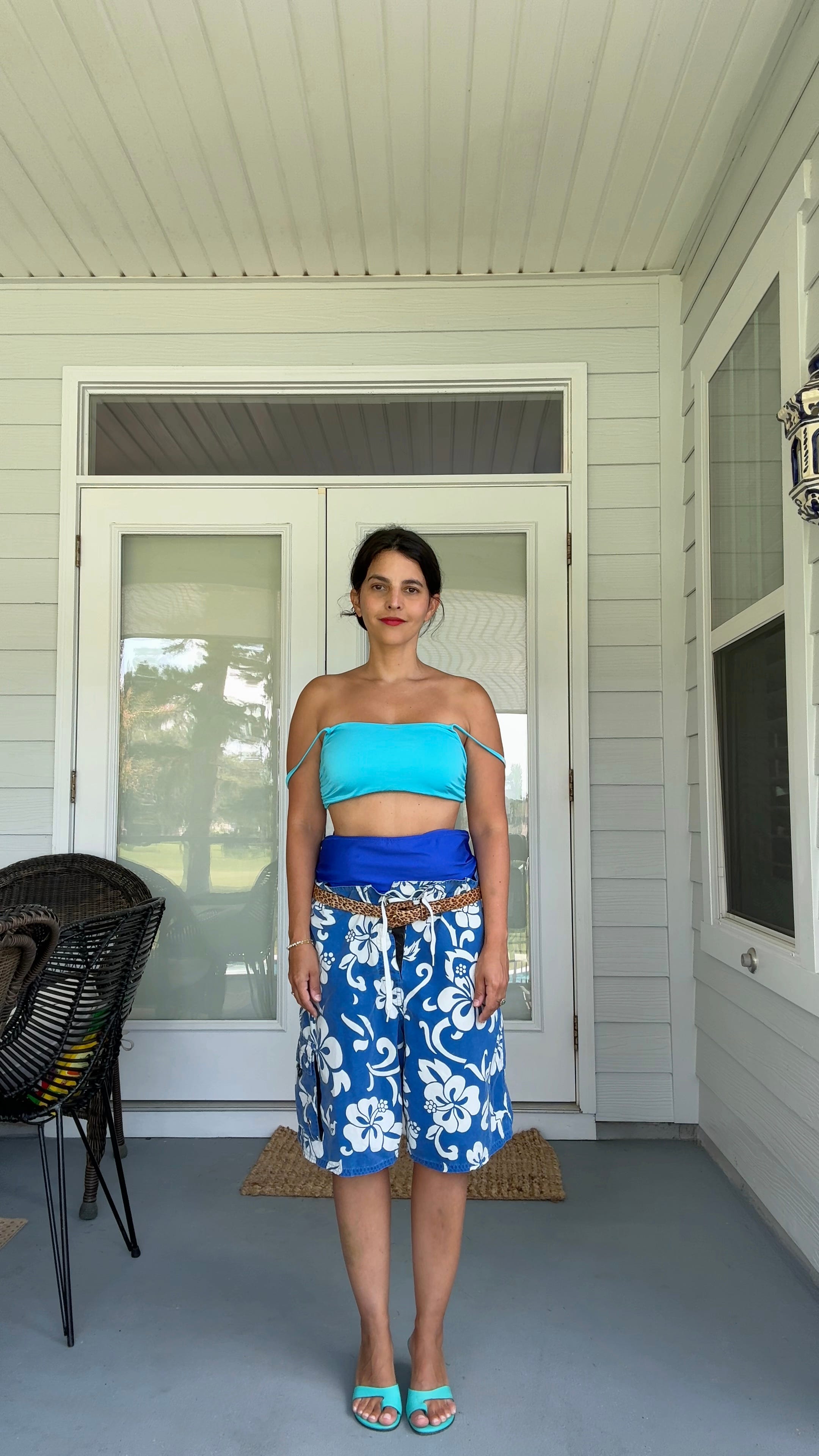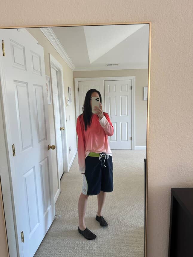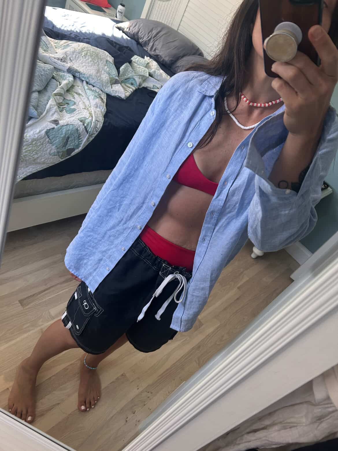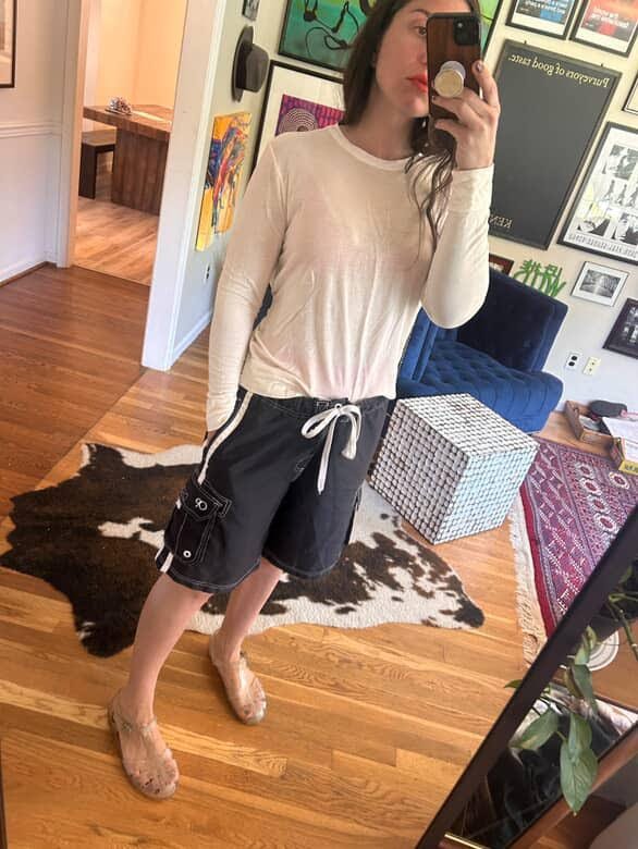 I don’t own a pair of board shorts, but here I am trying on a pair of athletic shorts in Hey Mrs. Solomon’s closet. Mentally sub in a pair of board shorts!”