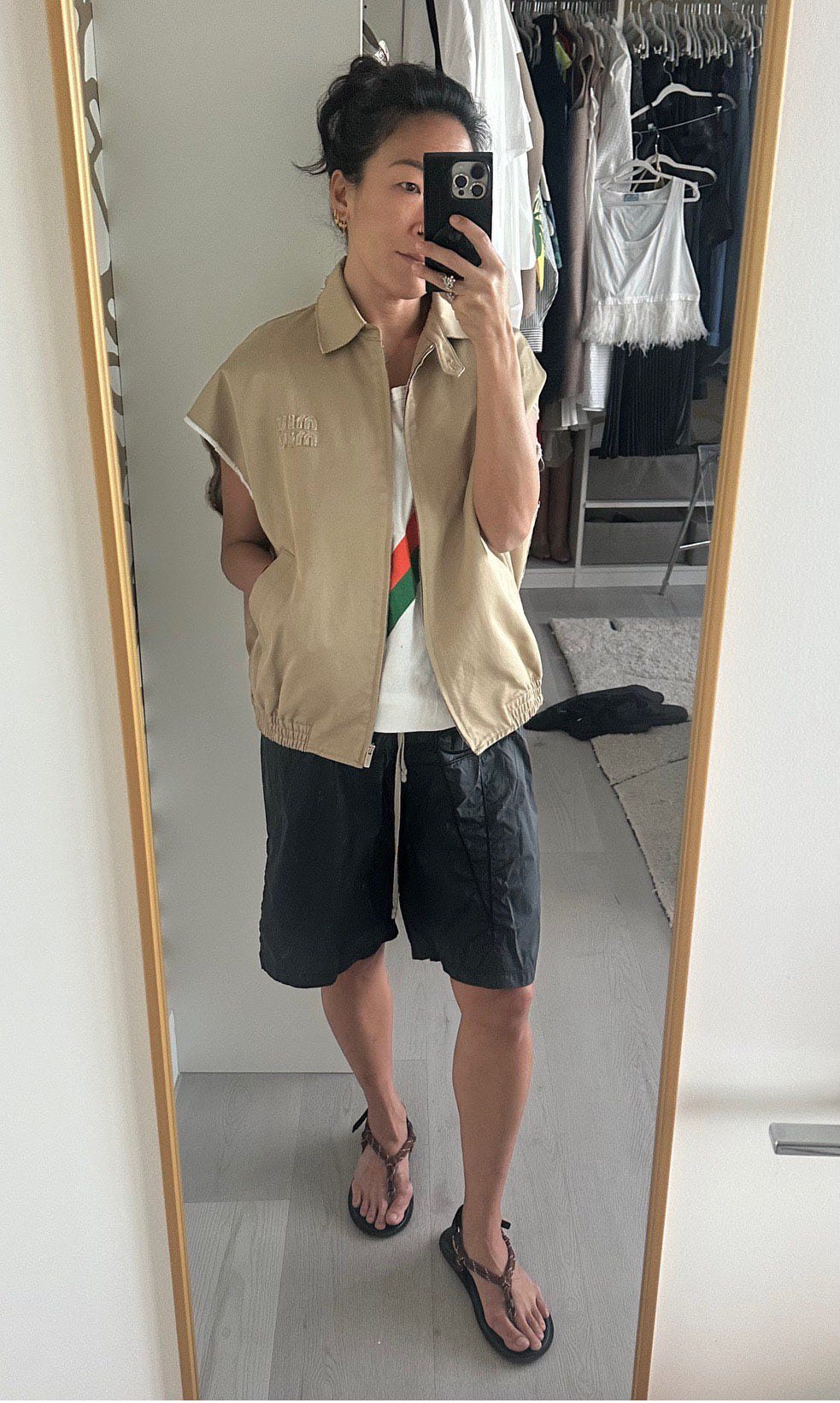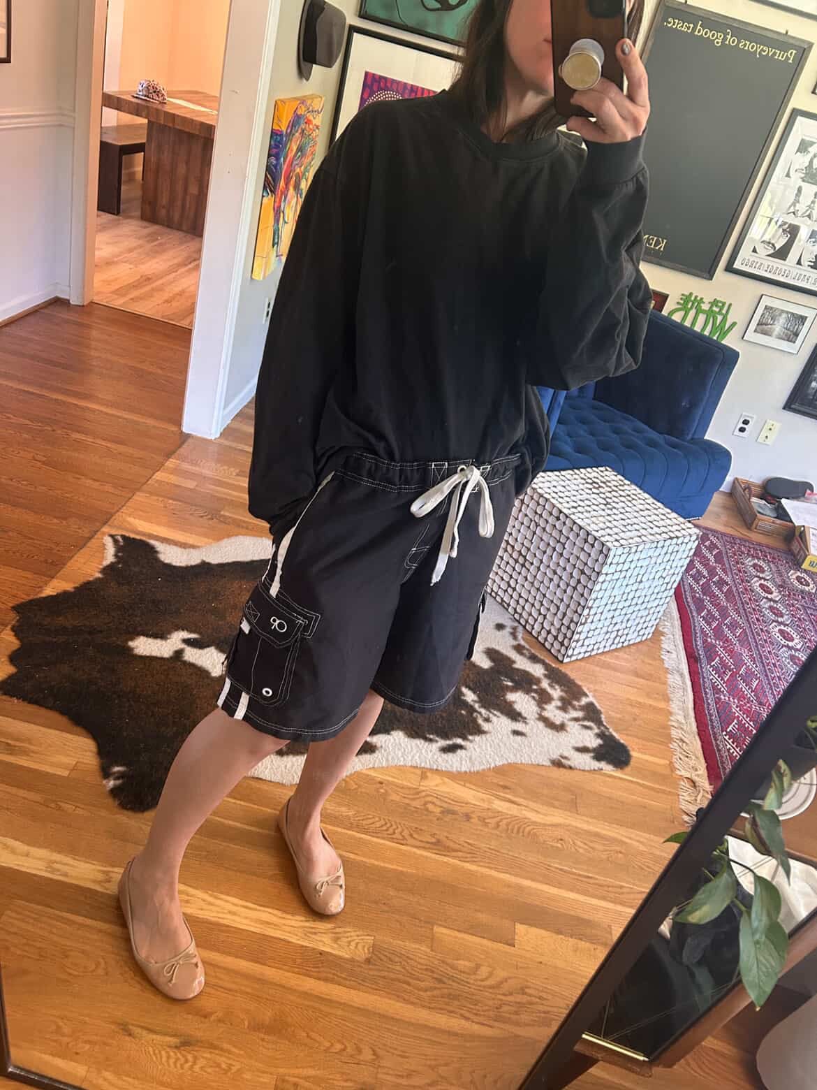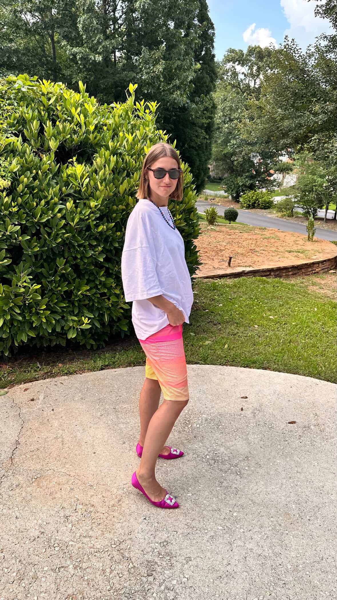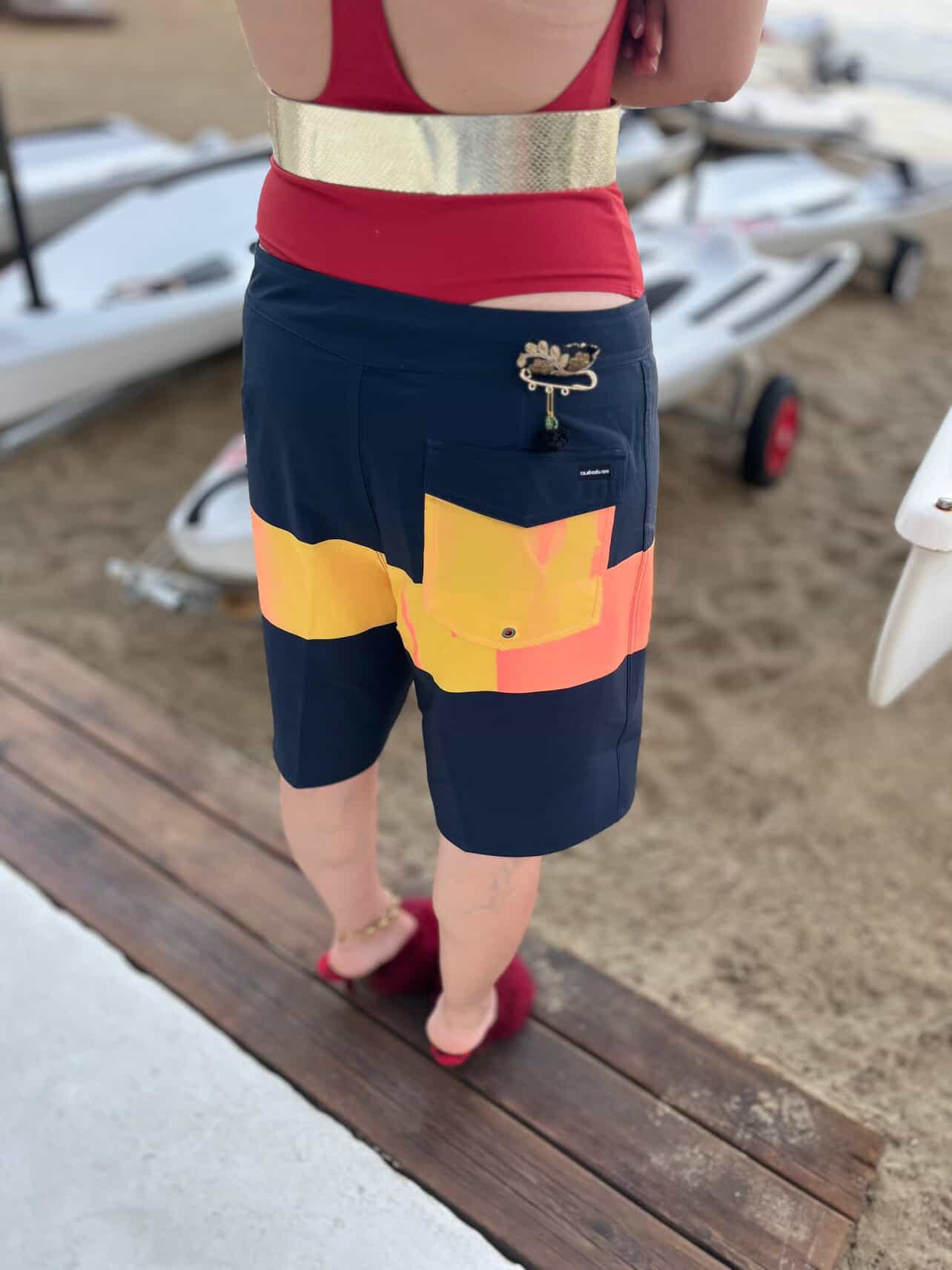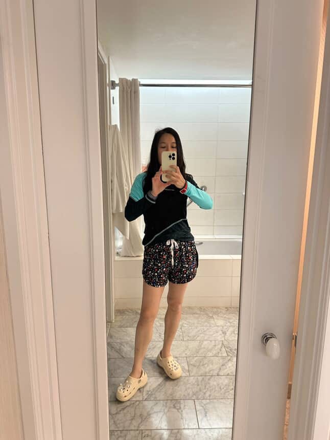 I don’t own a pair of board shorts, but here I am trying on a pair of athletic shorts in Hey Mrs. Solomon’s closet. Mentally sub in a pair of board shorts!”