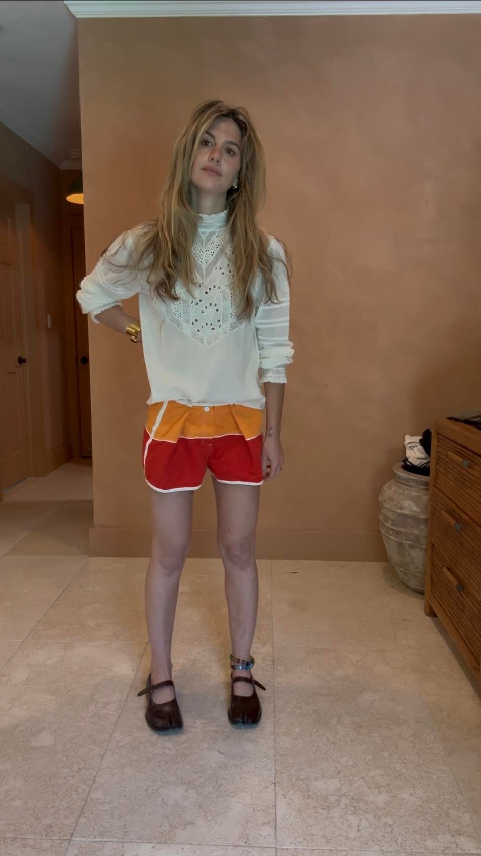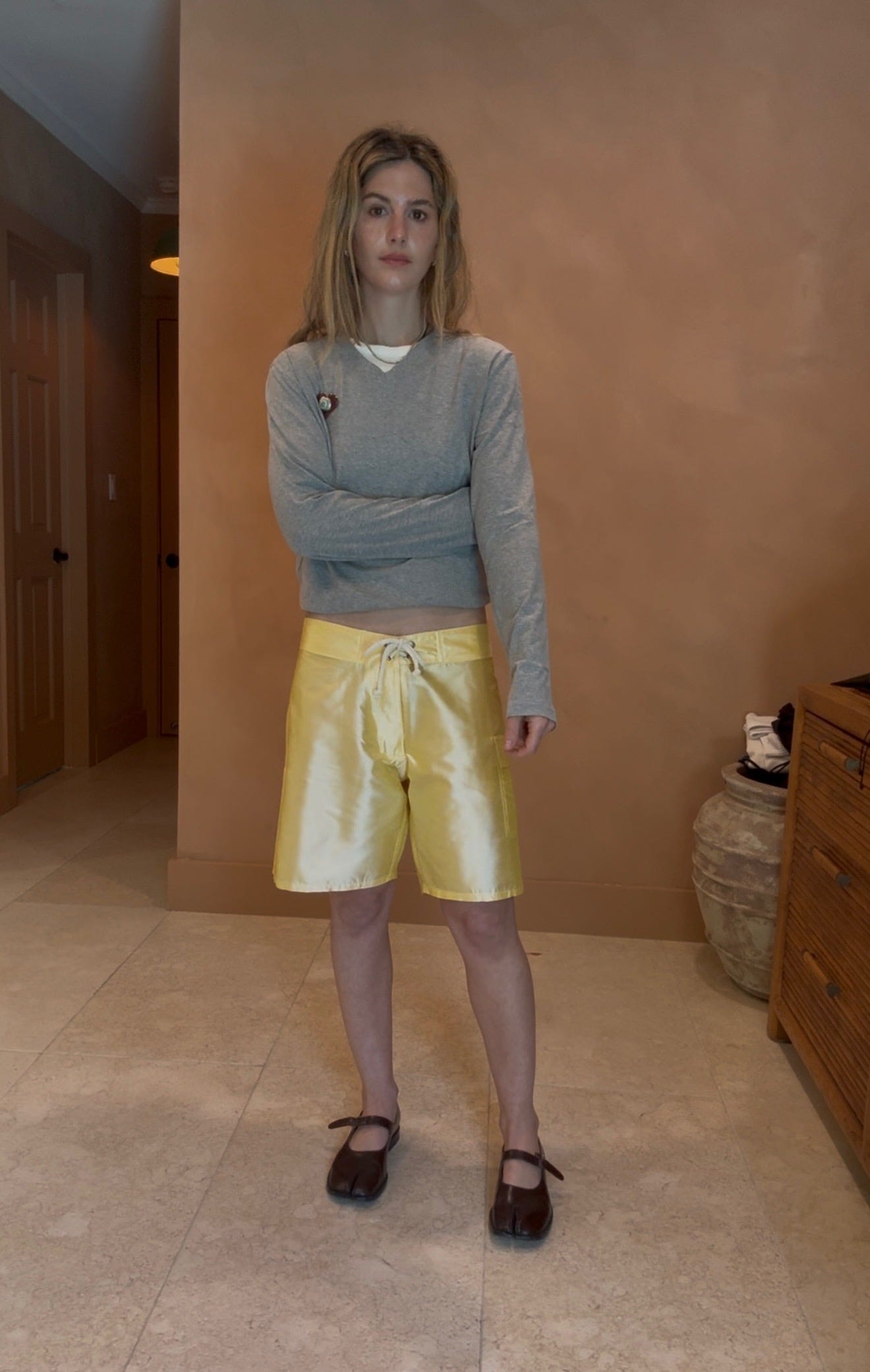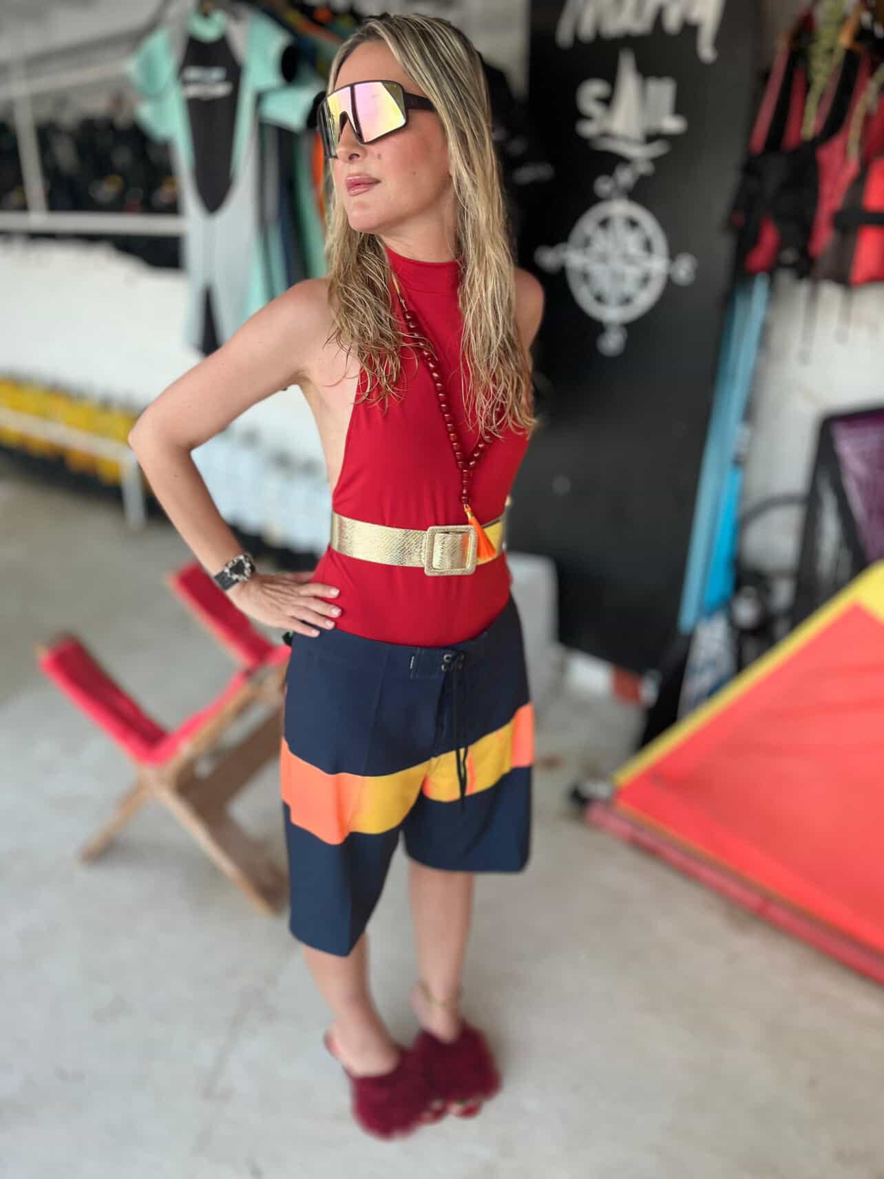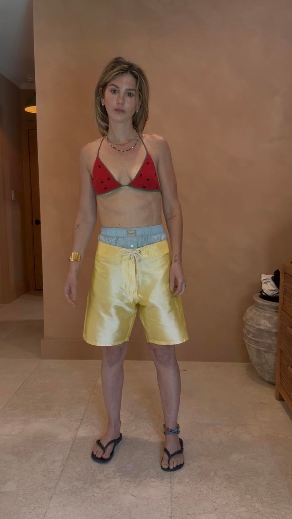“I love that board shorts are inherently sporty, so when I pair them with something softer or more feminine up top, it hits that mix I’m always chasing. That contrast of masculine/feminine is where I feel most like myself. They look best worn low slung on the hips” (think Alaïa! Lk)