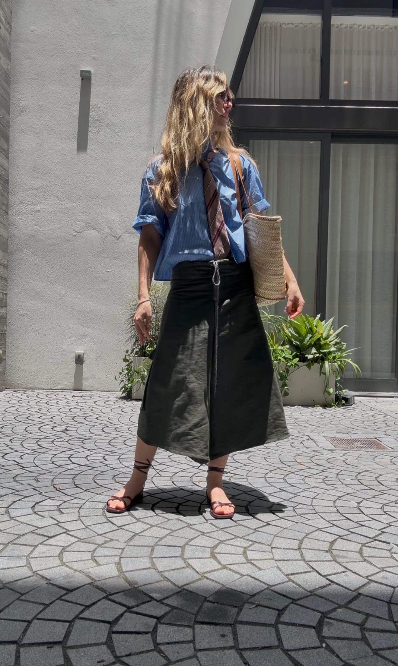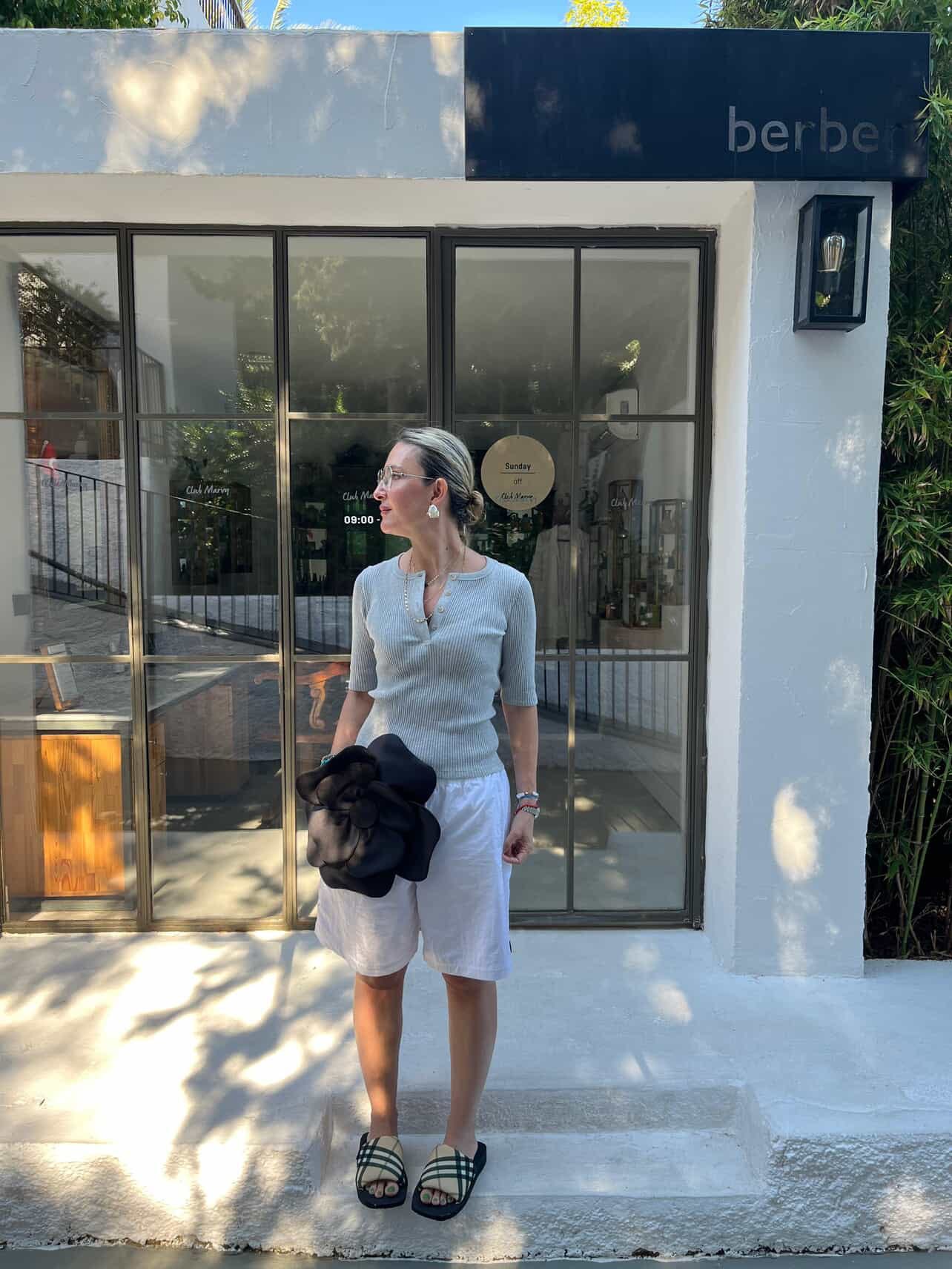 “When we were kids my parents often took us camping to the South of France. Most people surfed, but everyone, including the ones who didn’t, wore surf apparel. You would see board shorts from Roxy and Quicksilver and all those 2000 brands everywhere. That’s why seeing them making a comeback really made me nostalgic (and look at my husband board shorts with different eyes —in his defense he does really do surf!). I do think they need some kind of balance, to not make it look like I am actually going to the beach (unfortunately, I am not) without over-styling them so it doesn’t look like a costume. Something like a basic t-shirt and a fancy shoe really does that for me.”